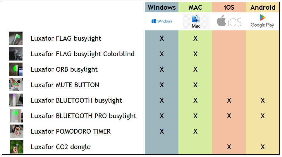 Luxafors mjukvarupaket är kompatibelt med Windows, MAC, iOS och Android. Programmen kan användas för att styra ett brett utbud av Luxafor-produkter. Översikten visar vilka Luxafor-produkter som kan användas med Luxafor-program / APP.